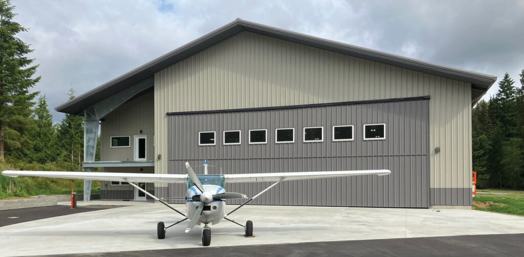 The hangar is a pre-engineered metal building (PEMB), also known as red iron, or structural steel. The sturdy structure is designed to handle the climate and weather conditions, protecting not only his family but his aircraft. Both the red iron frame and the steel siding were supplied by HCI Steel Buildings.